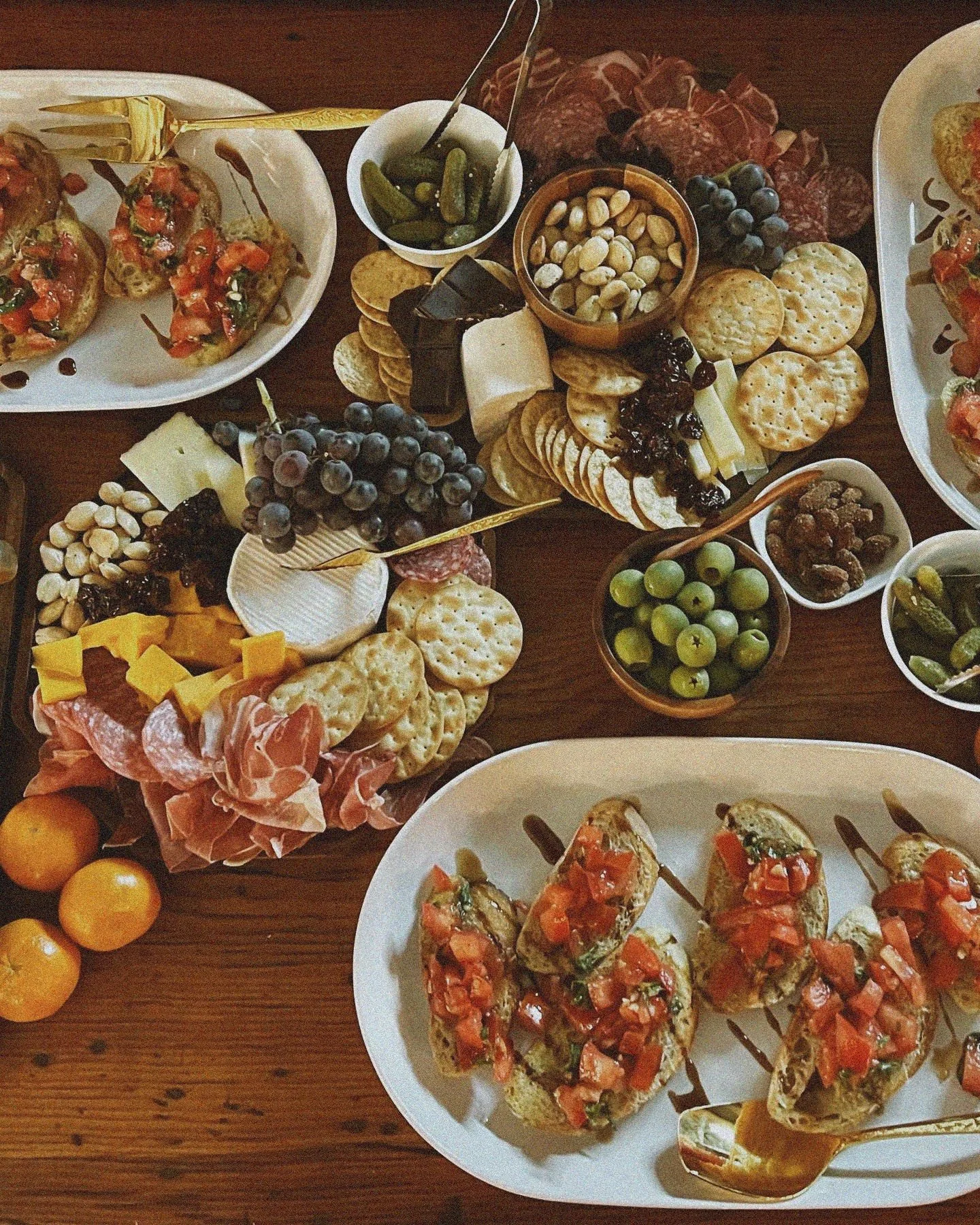 A timeless charcuterie experience featuring a selection of premium meats, artisanal cheeses, olives, dried and seasonal fresh fruits, nuts, artisanal jams and honey, gourmet mustard, rich chocolate, and a variety of crackers and fresh bread.